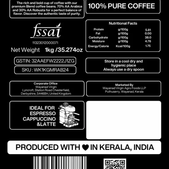 Our blend of Arabica and Robusta from the hills of Wayanad creates a balanced and dynamic flavor profile. It combines the smooth, fruity acidity and caramel sweetness of Arabica with the earthy, nutty tones and bold body of Robusta, along with hints of dark chocolate and mild spices for a rich, layered experience.